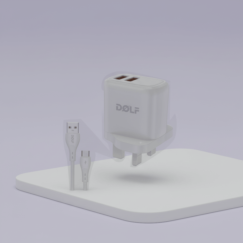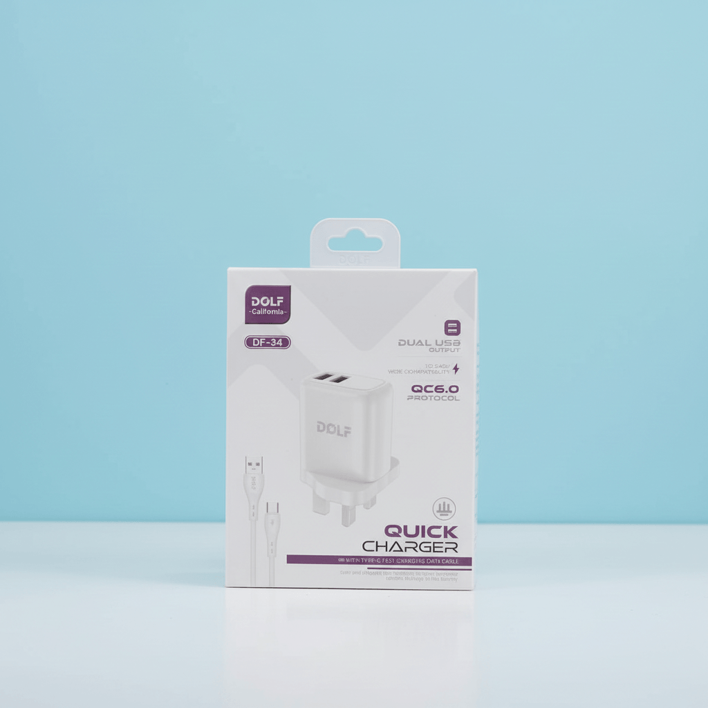 Charge 2 devices faster with the DOLF DF-34 QC6.0 Quick Charger. Includes Type-C cable, dual USB ports, and 110-240V compatibility for safe, efficient charging anywhere.