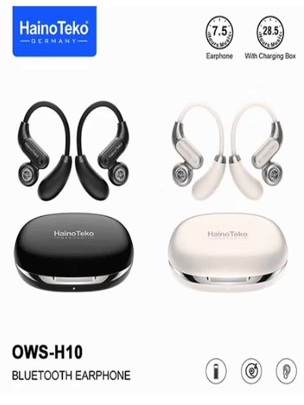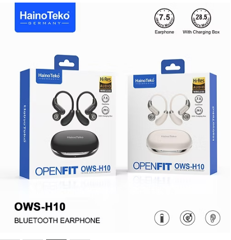 Haino Teko OpenFIT OWS-H10 Wireless Headphone Earphones feature an open-ear design for comfort and awareness. Each earbud includes a 50 mAh battery for dependable daily use. Lightweight, ergonomic, and wireless, they deliver clear sound and reliable performance for workouts, commuting, and all-day listening.