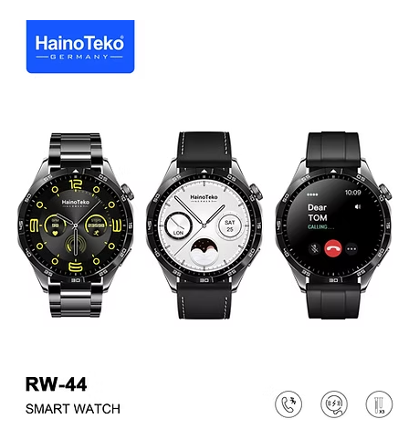 The Haino Teko RW44 Round Screen AMOLED Smartwatch offers a stylish design with a vibrant display and smooth touch control. It includes three interchangeable straps, a convenient wireless charger, and multiple smart features like fitness tracking, health monitoring, notifications, and sports modes, making it ideal for gents and boys.