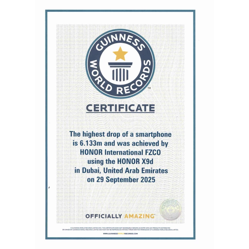 - Drop Resistance: HONOR X9d Holds Guinness Record — Highest Phone Drop Height (6.133m).