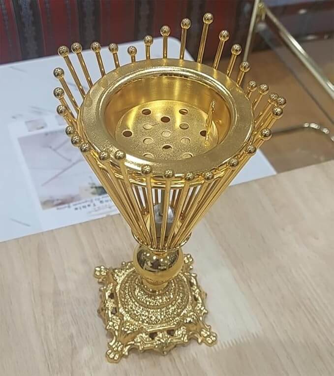 Luxury gold-plated incense burner crafted from premium metal, featuring an ornate Victorian-style base with elegant detailing. Designed as a decorative stand and functional burner, it adds sophistication to homes, prayer rooms, and offices while gently diffusing fragrance. Durable, stable, and visually striking, perfect for daily use or gifting.
