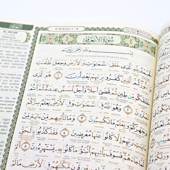 Recite with confidence and precision using the color-coded Tajweed system. MAQDIS NOBLE Al Quran Word for Word Translation Color Coded, Every rule of Tajweed is carefully highlighted in distinct colors, guiding you step-by-step toward correct pronunciation.